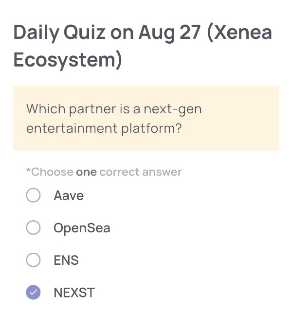 Xeneaの公式ブログおよびエコシステム情報によると、NEXSTは「次世代型エンターテインメントプラットフォーム」として明確に紹介されています。他の選択肢であるAave、OpenSea、ENSはいずれも著名なWeb3サービスですが、「エンターテインメント分野」に特化したパートナーではありません。そのため正解は NEXST です。