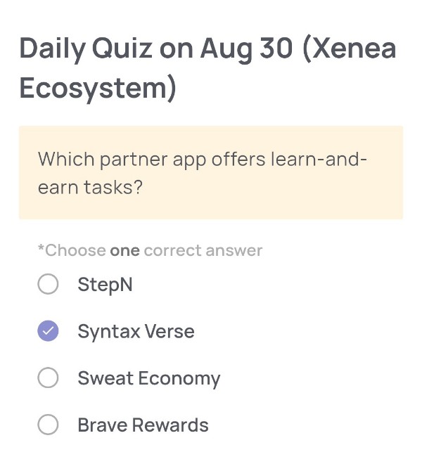Xenea公式ブログや最新のエコシステム紹介によると、パートナーアプリの中で「学んで稼ぐ(Learn-and-Earn)」形式のタスクを提供しているのは Syntax Verse です。他の選択肢の StepN や Sweat Economy は「Move-to-Earn(歩いて稼ぐ)」型、Brave Rewards は「広告閲覧で稼ぐ」仕組みのため、クイズの答えとしては適していません。