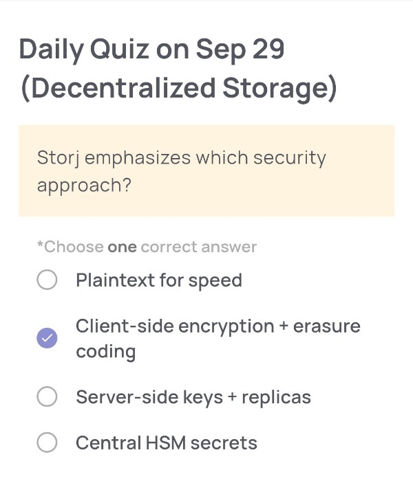 Storj prioritizes end-to-end security by encrypting files on the client side before uploading them to the network. This ensures that no storage node can access the plaintext data. Additionally, Storj uses erasure coding (splitting files into multiple redundant pieces and distributing them across independent nodes) rather than simple replication. This method improves both security (no single node holds enough data to reconstruct the file) and reliability (data can be recovered even if several nodes go offline).